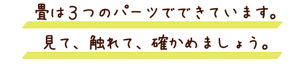 畳は、畳表・畳床・畳へりという3つのパーツでできています。現在では畳へりのない「へりなし畳」も人気ですが、へりのあるなしも含めて、畳を選ぶ時はこの3つがポイントになるということです。